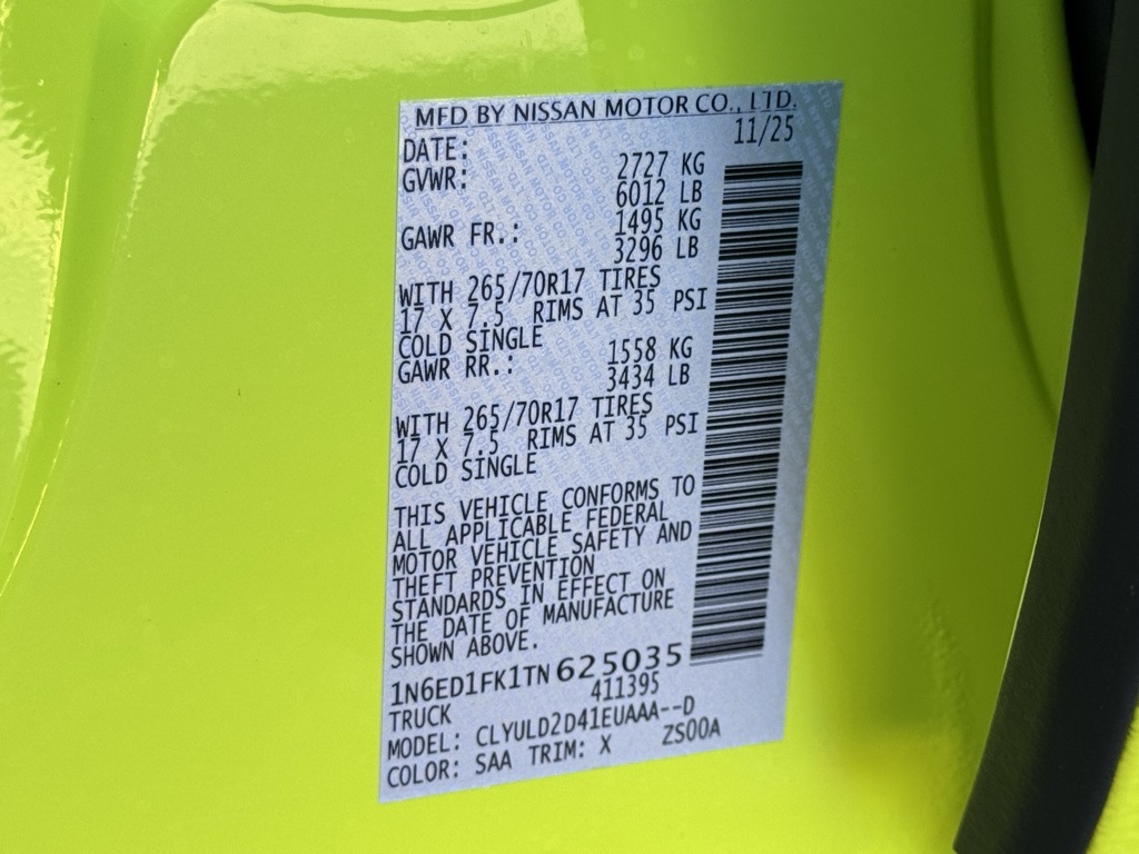 Tow Package, 4WD, 17" Painted Alloy Wheels, 3.692 Axle Ratio, 4-Wheel Disc Brakes, 6 Speakers, ABS brakes, Air Conditioning, Alloy wheels, AM/FM radio: SiriusXM, Anti-whiplash front head restraints, Auto High-beam Headlights, Automatic temperature control, Blind Spot Warning, Brake assist, Bumpers: body-color, Delay-off headlights, Driver door bin, Driver vanity mirror, Drop-In Bed Liner & Bumper Step, Dual front impact airbags, Dual front side impact airbags, Electronic Stability Control, Emergency communication system, Essentials Kit, Front anti-roll bar, Front Bucket Seats, Front Center Armrest, Front dual zone A/C, Front fog lights, Front reading lights, Front wheel independent suspension, Fully automatic headlights, Heated Front Bucket Seats, Heated front seats, Heated steering wheel, Illuminated entry, Knee airbag, Leather steering wheel, Low tire pressure warning, Mud Flaps, Occupant sensing airbag, Off-Road Style Step Rails, Overhead airbag, Overhead console, Panic alarm, Passenger door bin, Passenger vanity mirror, Power door mirrors, Power driver seat, Power passenger seat, Power steering, Power windows, Premium Paint, PRO Embroidered Premium Cloth Seat Trim, Radio data system, Radio: SXM/AM/FM/AUX/USB Audio System, Rear anti-roll bar, Rear seat center armrest, Rear side impact airbag, Rear step bumper, Remote keyless entry, Security system, Speed control, Speed-sensing steering, Split folding rear seat, Steering wheel mounted audio controls, Tachometer, Telescoping steering wheel, Tilt steering wheel, Traction control, Trip computer, Variably intermittent wipers, Voltmeter, and Wireless Apple CarPlay/Wireless Android Auto. Price includes all rebates: $2500 - Nissan Customer Cash. Exp. 01/05/2026
