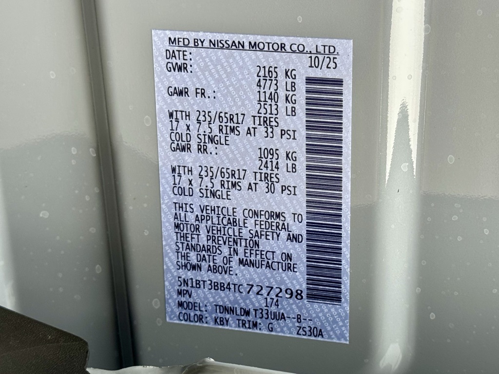 AWD, 4-Wheel Disc Brakes, 6 Speakers, ABS brakes, Air Conditioning, Alloy wheels, AM/FM radio: Sirius, Apple CarPlay/Android Auto, Auto High-beam Headlights, Automatic temperature control, Black Splash Guards (set of 4), Brake assist, Delay-off headlights, Driver door bin, Driver vanity mirror, Dual front impact airbags, Dual front side impact airbags, Electronic Stability Control, Emergency communication system: NissanConnect Services, First Aid Kit, Four wheel independent suspension, Front anti-roll bar, Front Bucket Seats, Front Center Armrest, Front dual zone A/C, Front reading lights, Fully automatic headlights, Heated door mirrors, Heated Front Bucket Seats, Heated front seats, Illuminated entry, Knee airbag, Leatherette and Ballistic Nylon Seating, Low tire pressure warning, Occupant sensing airbag, Outside temperature display, Overhead airbag, Overhead console, Panic alarm, Passenger door bin, Passenger vanity mirror, Power door mirrors, Power driver seat, Power Liftgate, Power steering, Power windows, Premium Paint, Radio data system, Radio: AM/FM NissanConnect, Rear anti-roll bar, Rear seat center armrest, Rear side impact airbag, Rear window defroster, Rear window wiper, Remote keyless entry, Roof rack, Speed control, Speed-sensing steering, Speed-Sensitive Wipers, Split folding rear seat, Spoiler, Steering wheel mounted audio controls, Tachometer, Telescoping steering wheel, Tilt steering wheel, Traction control, Trip computer, Variably intermittent wipers, and Wheels: 17" Dark Painted Alloy. Price includes all rebates: $2500 - Nissan Customer Cash. Exp. 01/05/2026