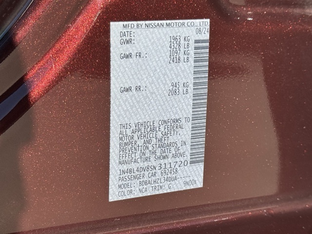 Certification Program Details: This Vehicle qualifies for Complimentary 7 year 250,000 Mile Limited Power Train Warranty. Huge Value. Vehicle age max 8yrs / under 85k miles. See Dealer for Details. 17" Machined Alloy Wheels, 4-Wheel Disc Brakes, 6 Speakers, ABS brakes, Air Conditioning, Alloy wheels, AM/FM radio: SiriusXM, Auto High-beam Headlights, Blind Spot Warning, Brake assist, Bumpers: body-color, Cloth Seat Trim, Delay-off headlights, Driver door bin, Driver vanity mirror, Dual front impact airbags, Dual front side impact airbags, Electronic Stability Control, Floor Mats/Trunk Mat/Hideaway Net, Four wheel independent suspension, Front anti-roll bar, Front Bucket Seats, Front Center Armrest, Front reading lights, Fully automatic headlights, Illuminated entry, Knee airbag, Low tire pressure warning, NissanConnect featuring Apple CarPlay and Android Auto, Occupant sensing airbag, Outside temperature display, Overhead airbag, Overhead console, Panic alarm, Passenger door bin, Passenger vanity mirror, Power door mirrors, Power driver seat, Power steering, Power windows, Radio data system, Radio: AM/FM Audio System, Rear anti-roll bar, Rear Parking Sensors, Rear reading lights, Rear seat center armrest, Rear side impact airbag, Rear window defroster, Remote keyless entry, Security system, Speed control, Speed-sensing steering, Speed-Sensitive Wipers, Split folding rear seat, Steering wheel mounted audio controls, Tachometer, Telescoping steering wheel, Tilt steering wheel, Traction control, Trip computer, and Variably intermittent wipers.